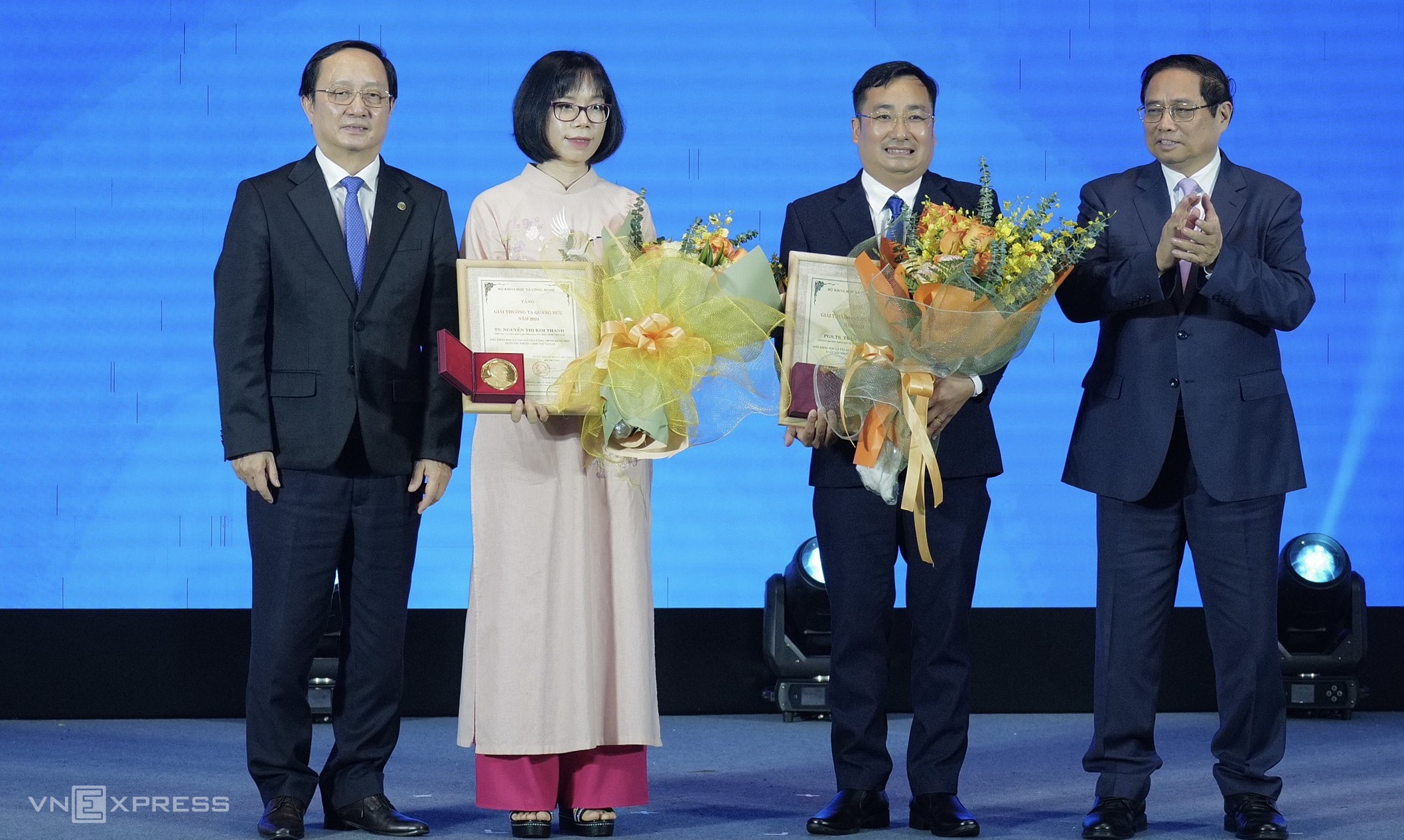 Thủ tướng Phạm Minh Chính (bìa phải) tặng hoa và Bộ trưởng Khoa học và Công nghệ Huỳnh Thành Đạt (bìa trái) trao giải thưởng cho hai nhà khoa học thắng giải Tạ Quang Bửu 2024, PGS.TS Trần Mạnh Trí và TS Nguyễn Thị Kim Thanh. Ảnh: Ngọc Thành