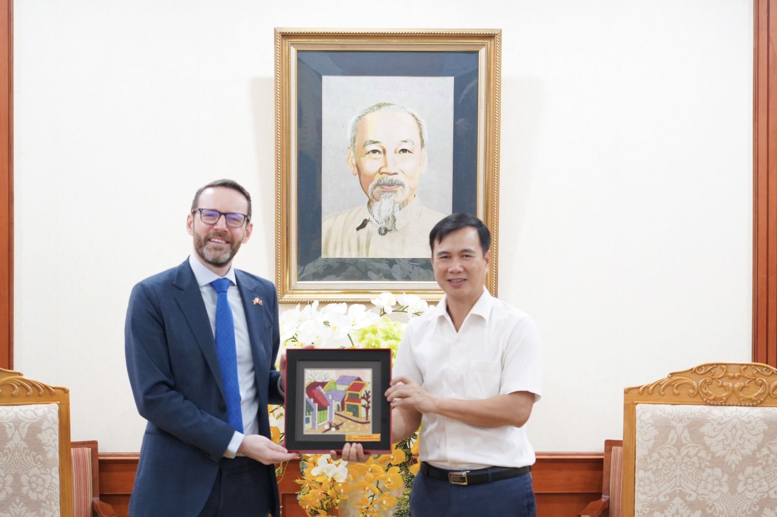 Thứ trưởng Bùi Thế Duy tặng quà lưu niệm cho Đại sứ Anh Iain Frew.