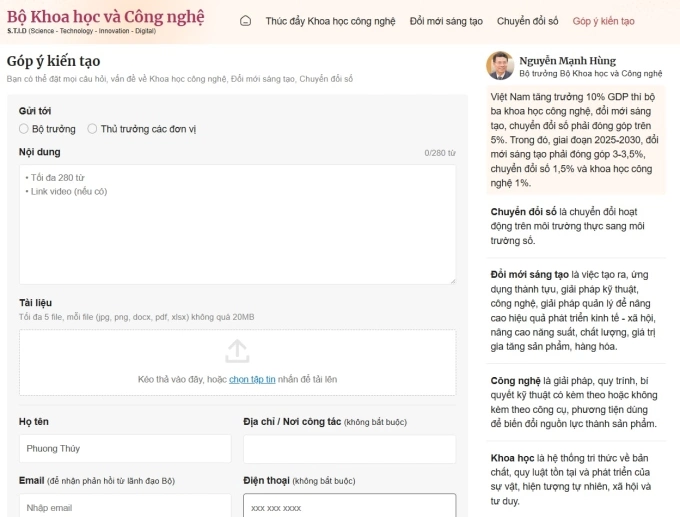 Cổng "Góp ý kiến tạo" là cầu nối để người dân, doanh nghiệp gửi ý kiến, góc nhìn, đề xuất tới Bộ trưởng Nguyễn Mạnh Hùng và các lãnh đạo Bộ Khoa học và Công nghệ.